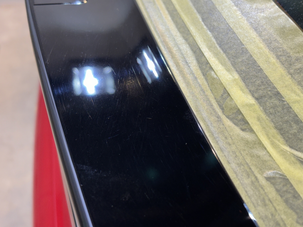 このような傷が全体にあり濃色車のため照明を当てるとはっきりと目立っています。
