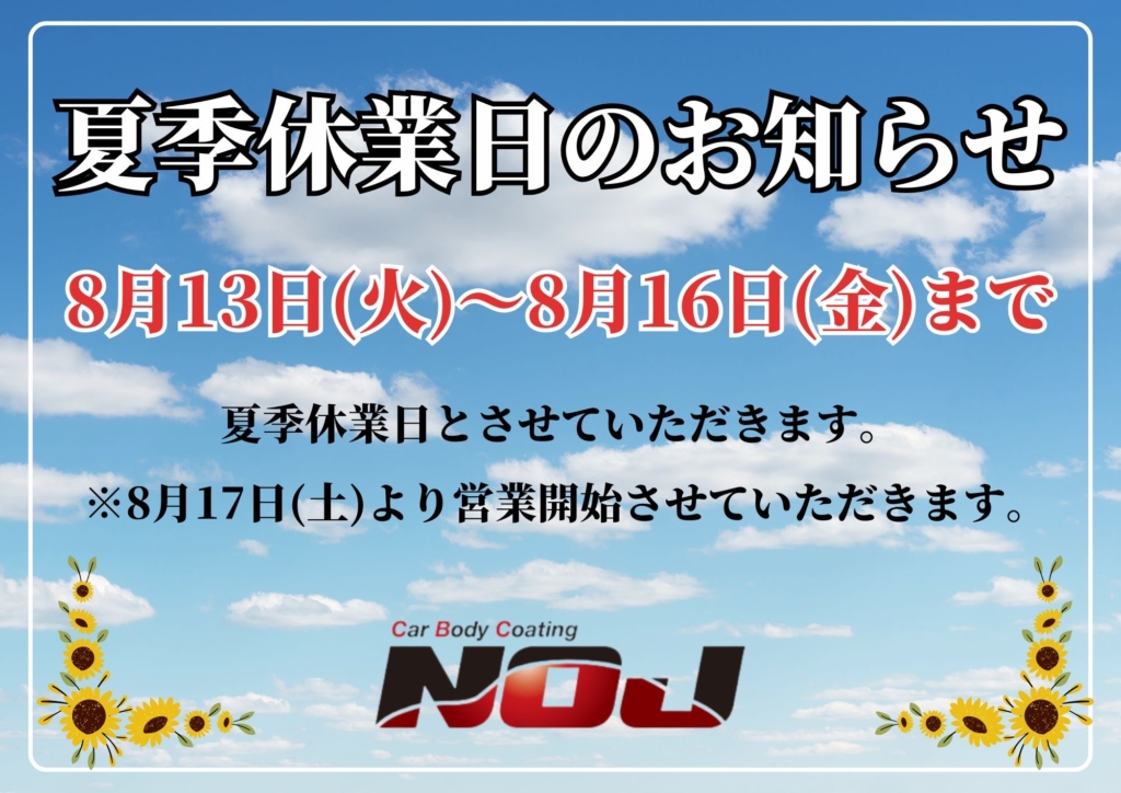 【ガラスコーティング 専門店NOJ横浜港北店】夏季休業のお知らせ8/13~8/16まで!